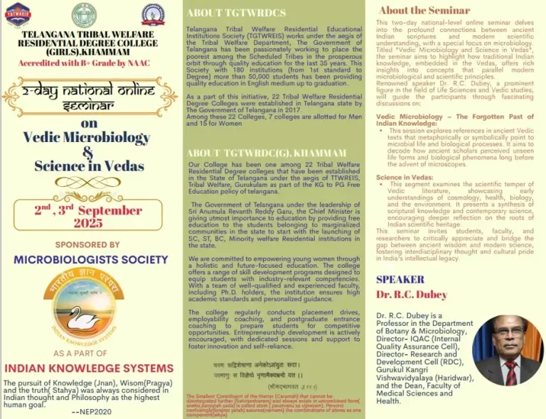*सत्यं ज्ञानमनन्तं ब्रह्म । *(Taittiriya Upanishad)Satyaṁ jñānam anantaṁ brahma.Meaning: Truth, knowledge, and infinity — that is the nature of the ultimate reality.As a part of NEP-2020 Our College follows the below said line*Ancient Wisdom, Modern Vision* Greetings from Department Of Life Sciences *TGTWRDC(G ) KHAMMAM* in Collaboration with *MBSI Microbiology Society India*You are cordially invited to our upcoming online seminar Topic: Vedic Microbiology* & Science in Vedas Join us for an engaging discussion and insightful presentations. Details- Date: 2-9-2025 & 3-9-2025– Platform: Zoom– Speaker: Dr.R.C.Dubey Registration Linkhttps://forms.gle/ccMg6QnheChKBVhi6 For Queries:9492771858 | 9493316769 | 9491063083 We look forward to your active participation! Information Brochure