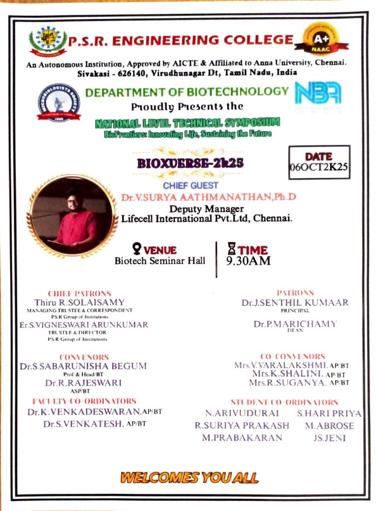 The objective of the National Level Technical Symposium “BIOFRONTIERS: INNOVATING LIFE, SUSTAINING THE FUTURE – BIOXVERSE 2025” is to provide a dynamic platform for students, researchers, and professionals to explore recent advancements in biotechnology, encourage knowledge sharing and interdisciplinary collaboration, bridge the gap between academics and industry, promote research and innovation, and create awareness on sustainable biotechnological practices. The event aims to inspire scientific curiosity, foster skill development, and empower participants to contribute innovative and sustainable solutions for future challenges in the life sciences.
