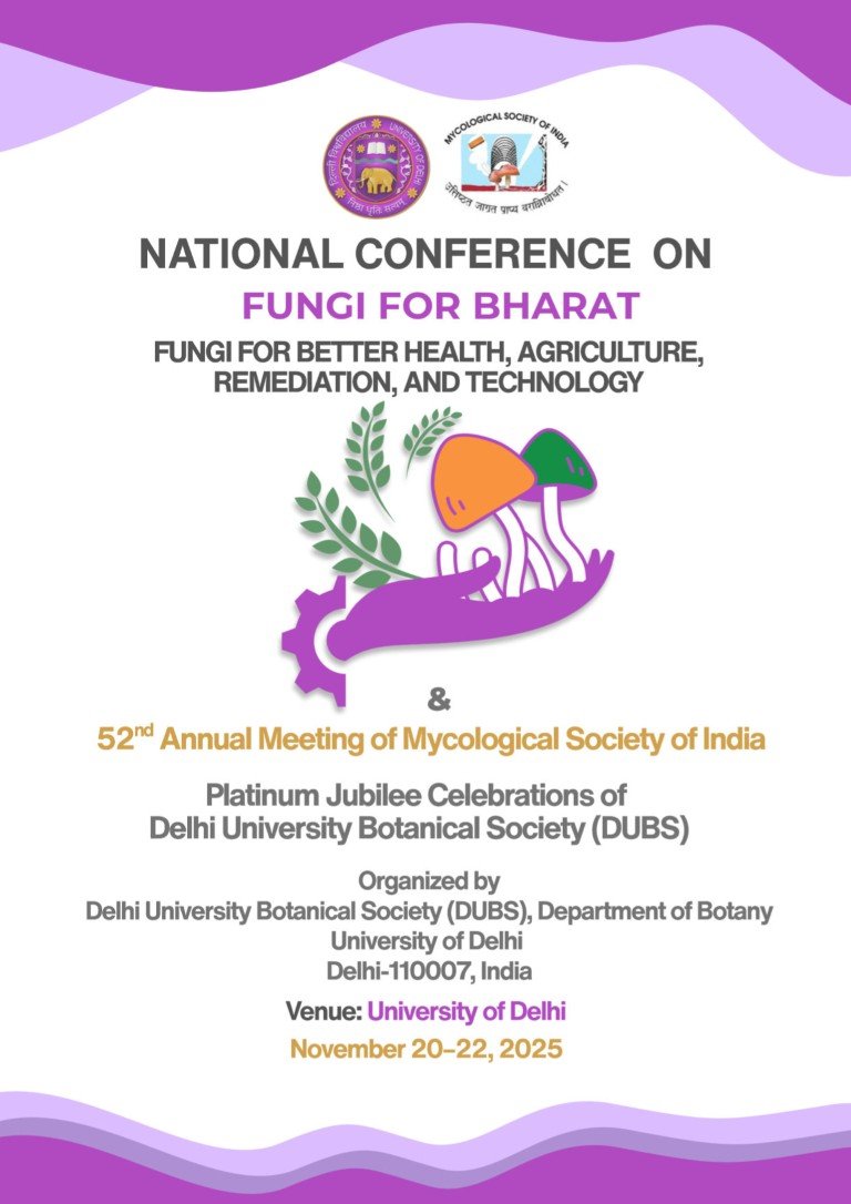 National Conference on Fungi for Bharat Date: November 20-22, 2025 Organized by: Delhi University Botanical Society (DUBS), Department of Botany, University of Delhi Information Brochure Registration Form Related Link 1 Related Link 2 Related Link 3
